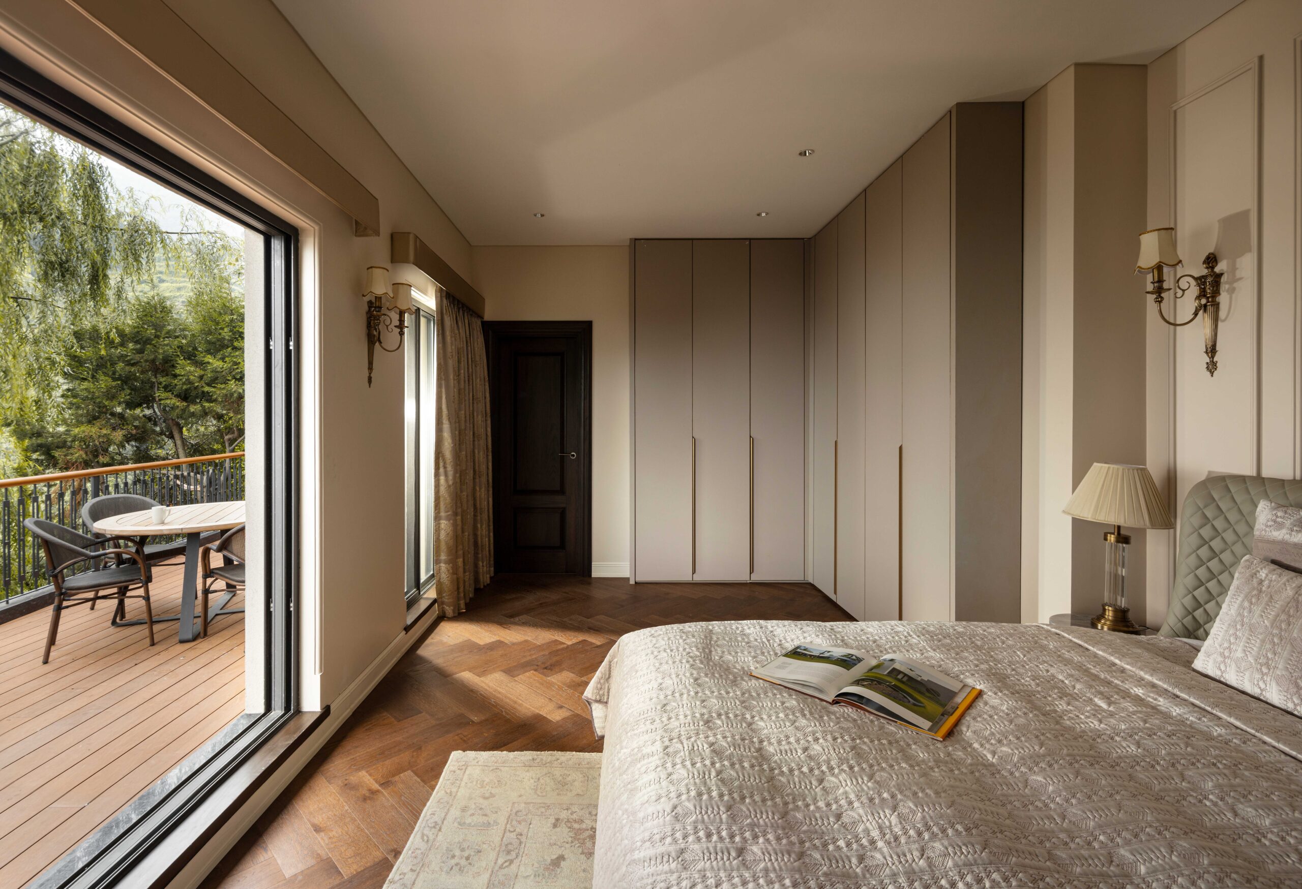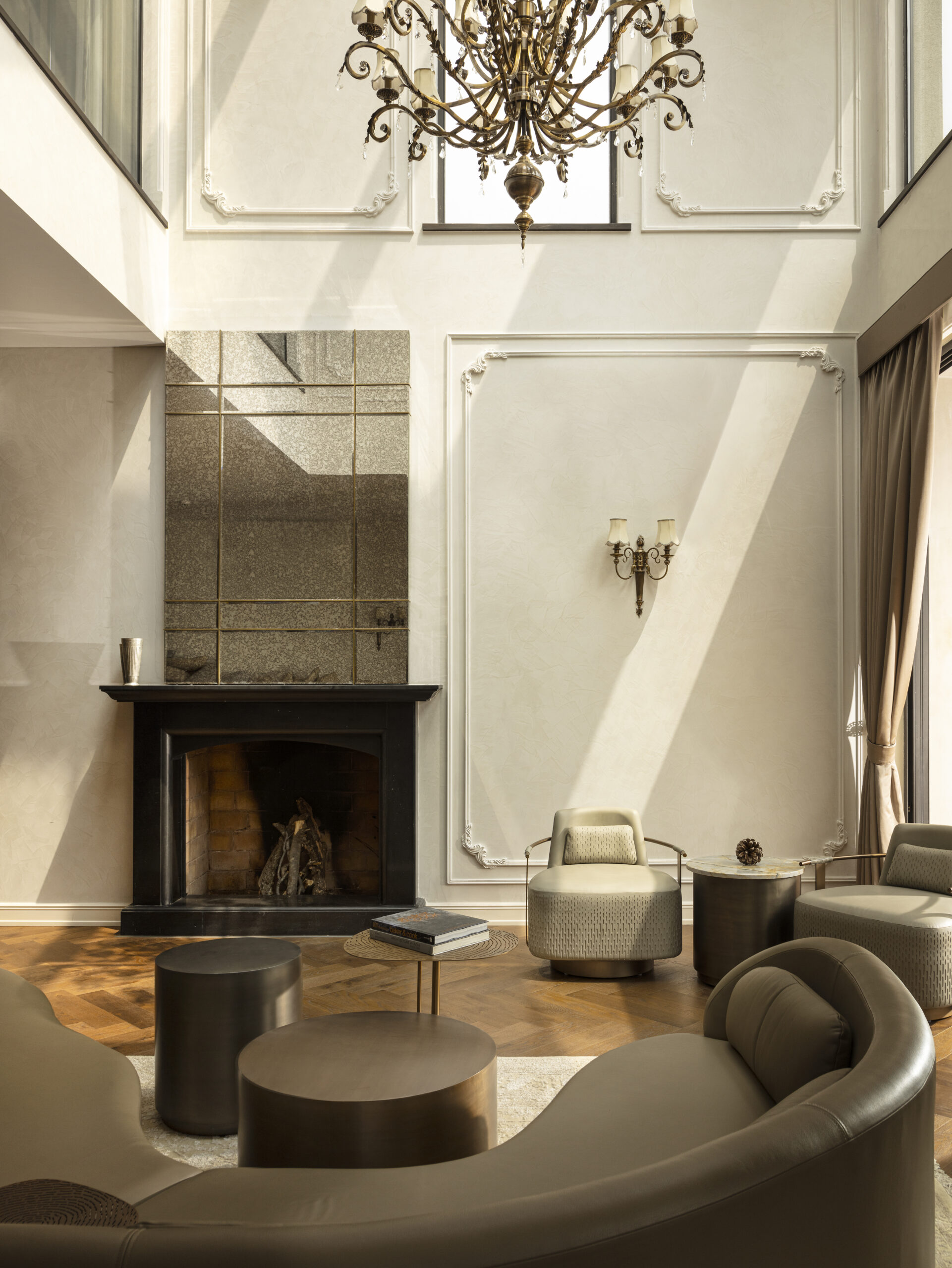 A warm and neutral palette – with oak floors, off white textured walls & veneer paneling – along with an eclectic blend of furniture & furnishings exude a feeling of comfort and remind one of home.